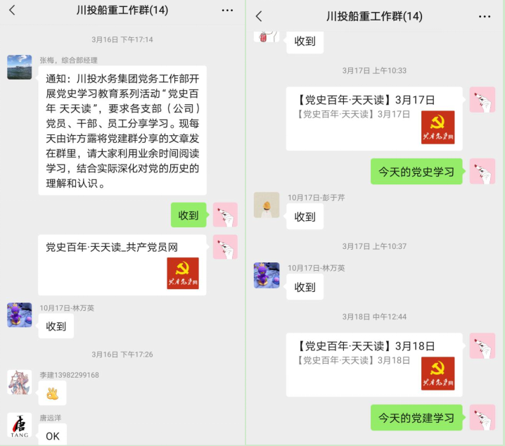 四川川投船重环境科技有限公司响应国家及川投集团、川投水务集团关于开展党史学习教育系列活动的具体要求,从3月16日开始,利用微信每日组织公司全体人员学党史、用党史。