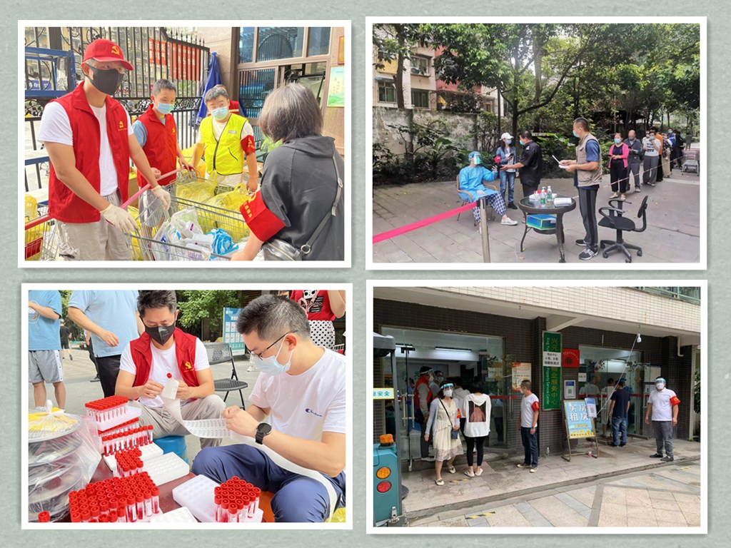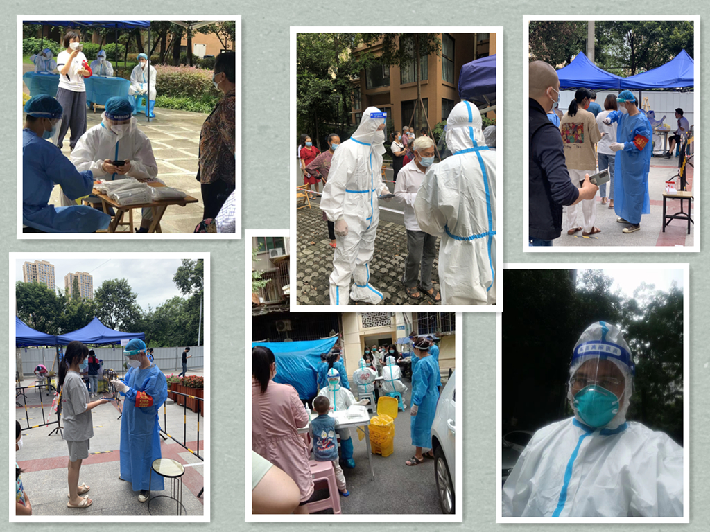 “各司其职、定格坚守”“请有序排队、老年人请这边先做”“大爷、大妈,我来帮您扫码”“来小朋友,嘴巴张大,啊!”“大白”“小蓝”志愿者们各司其职,引导着居民们排队扫码核酸采样,医护人员们也有条不紊地为居民进行核酸采样。“一管管采样试剂、一滴滴艰辛汗水、一条条脸庞勒痕”他们没有喊苦喊累,依然用心用情地为居民们服务。