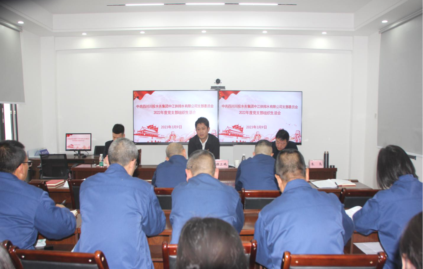 2023年3月9日,中江水司党支部组织召开2022年度组织生活会暨民主评议党员大会,会议由党支部书记朱禹主持,支部16名党员同志参加会议。川投水务集团副总经理谭卫鹏率党群纪检部工作人员进行了现场督导。