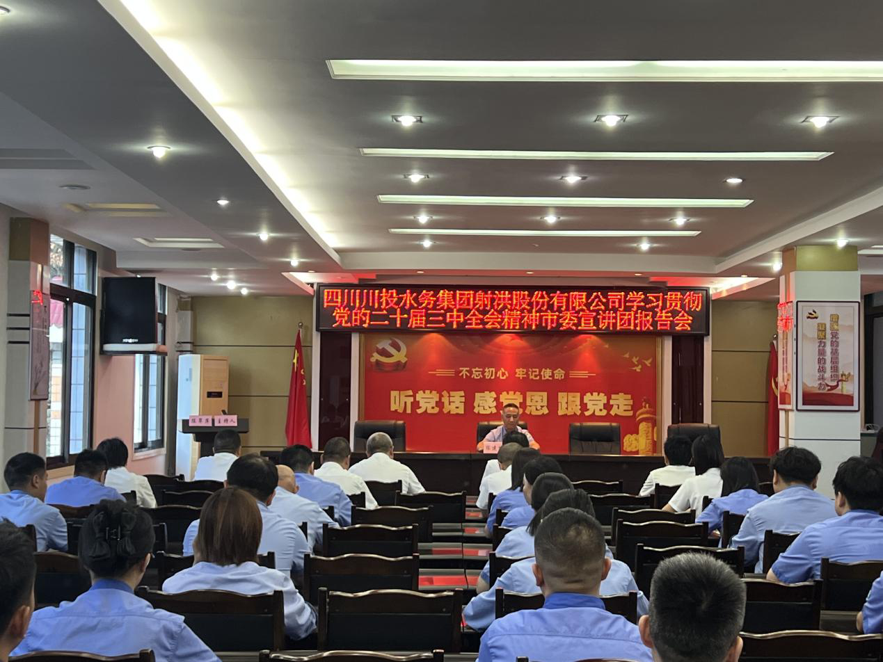 9月13日,川投水务射洪公司举行学习贯彻党的二十届三中全会精神市委宣讲团报告会。遂宁市劳动模范、射洪市委宣讲团劳模工匠宣讲分团成员、公司制水调度班班长陈建峰同志作宣讲报告,射洪市总工会代表、公司领导班子、全体党员、职工代表共计50余人参加了会议。