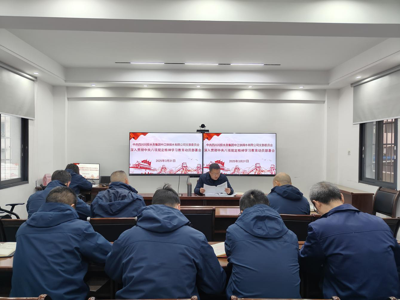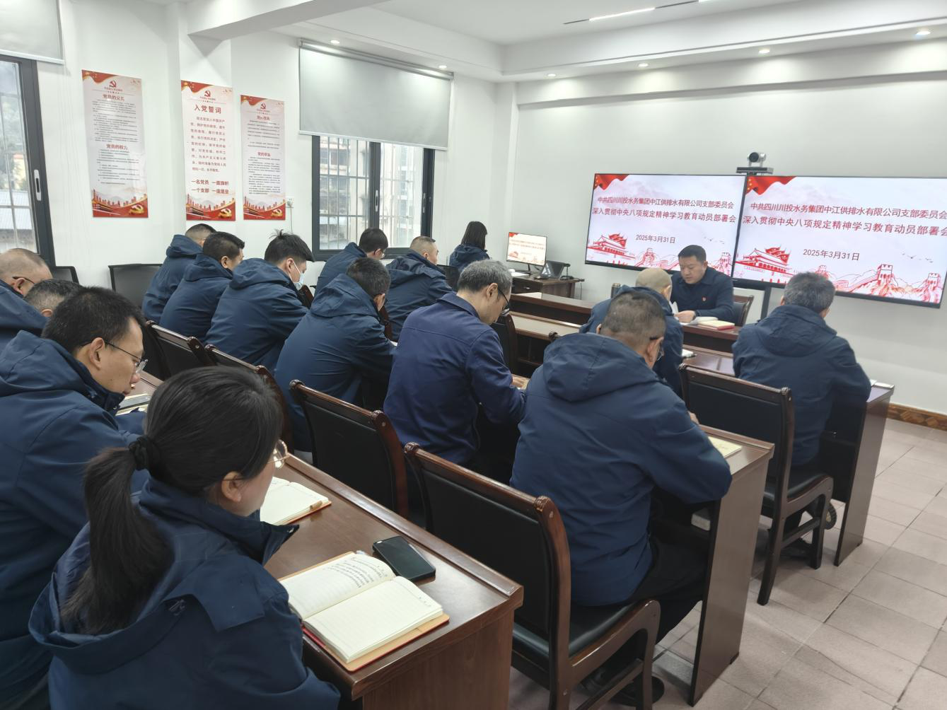 2025年3月31日,中江公司组织召开深入贯彻中央八项规定精神学习教育动员部署会议,深入学习习近平总书记关于加强党的作风建设重要论述,传达相关文件精神,安排部署公司学习教育工作。公司党支部书记朱禹主持会议并作动员讲话,公司中层以上管理人员、支部党员、入党积极分子共计24人参加了会议。