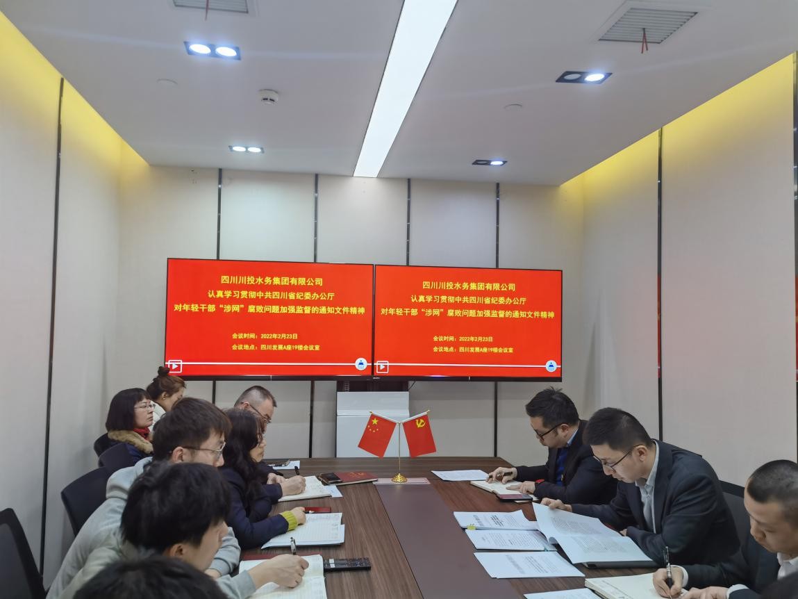 2022年2月23日,川投水务集团组织召开专题宣贯会议,专题传达学习省纪委办公厅《关于对年轻干部“涉网”腐败问题加强监督的通知》文件精神,川投水务集团党委委员、副总经理严斯亮主持会议,并提出相关学习贯彻要求。