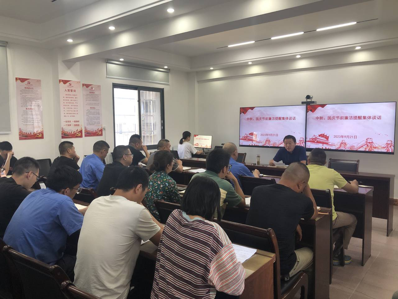 中秋、国庆双节将至,为重申党的纪律和廉洁自律规定,敲响节前廉洁警钟,拧紧纪律作风“发条”,持续推进党风廉政建设。9月21日,中江水司组织开展“强化节前廉洁教育 筑牢廉洁思想防线”主题党日活动。