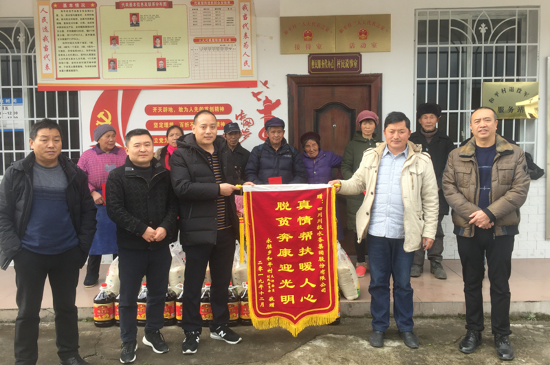 在行驶近6小时车程后,工作组到达了海拔1500多米的和平村。在和平村政府相关人员的陪同和村民们热情的招呼声下,但书记快步向前与他们一一握手,将带来的大米、食用油、慰问金等慰问品送到贫困户手中,并对他们致以新年的祝福。随后,和平村村支部书记刘文川代表全体村民向川投水务赠送“真情帮扶暖人心、脱贫奔康迎光明”锦旗,为川投水务长期以来开展高标准精准扶贫表示衷心感谢。