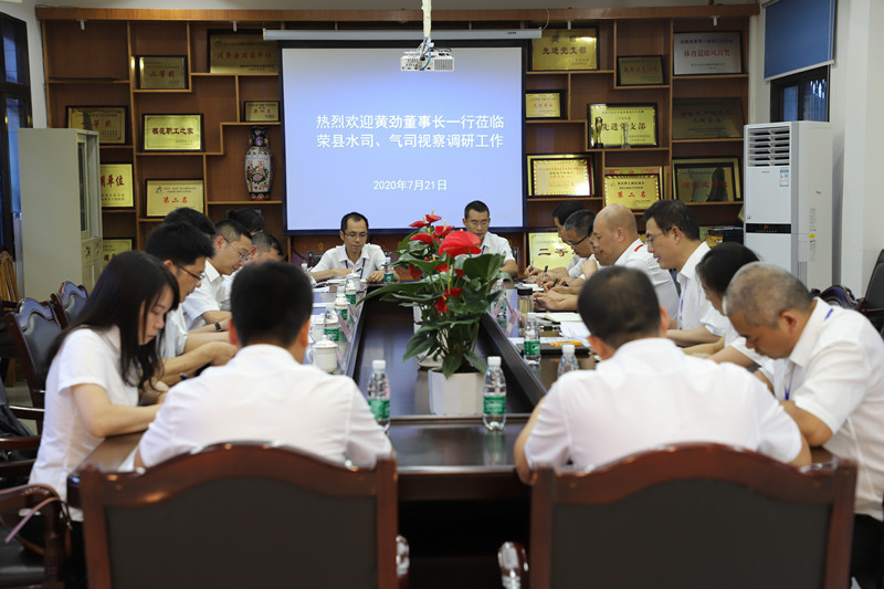 实地视察调研结束后,黄董事长一行在荣县水司会议室召开了工作座谈会。会上,荣县水司党支部书记、总经理龚庆,荣县气司党支部书记、总经理王文川分别从企业基本情况、上半年指标完成情况、存在问题及下一步工作计划等方面进行了详细的汇报。黄董事长充分肯定了荣县水司、气司在生产经营管理上的具体举措和取得的成绩,并从“围绕一个中心,加强一个领导,夯实三个基础”提出了具体工作要求:一是要紧紧围绕发展中心任务,继续巩固和拓展现有城乡市场,持续降本增效,强化合规管理,同时加强与地方党政的汇报沟通,提升服务质量和效能,营造良好的经营环境;二是要全面加强党的领导,实现企业党建与生产经营的有机融合,不断巩固和提升党对企业改革发展的领导核心地位;三是要夯实安全环保、廉政建设和常态化疫情防控三个基础,当前重点做好汛期安全工作,强化责任担当,提高防范意识,全力确保安全平稳供水、供气和水质达标。