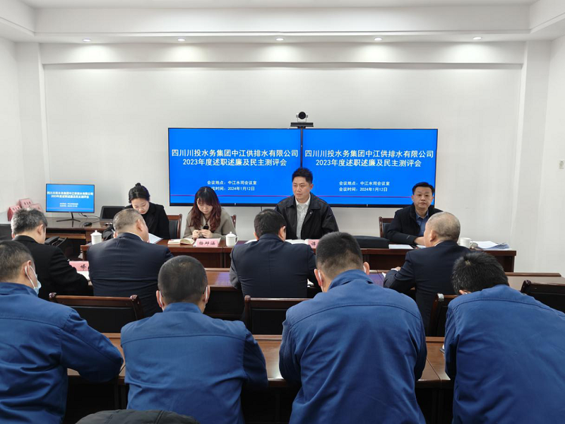 2024年1月12日,川投水务集团副总经理谭卫鹏率党群工作部部长李至彬一行赴中江公司开展2023年度党群、纪检、人力资源、合规化管理综合考评,并召开述职述廉及民主测评会。中江公司领导班子、中层管理人员及职工代表共计32人参加考评会议。