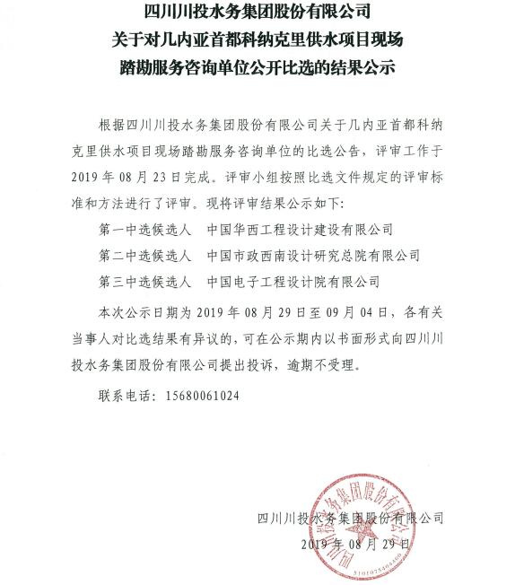 上一条:四川川投水务集团股份有限公司 关于几内亚首都科纳克里供水项目现场踏勘服务咨询单位比选公告